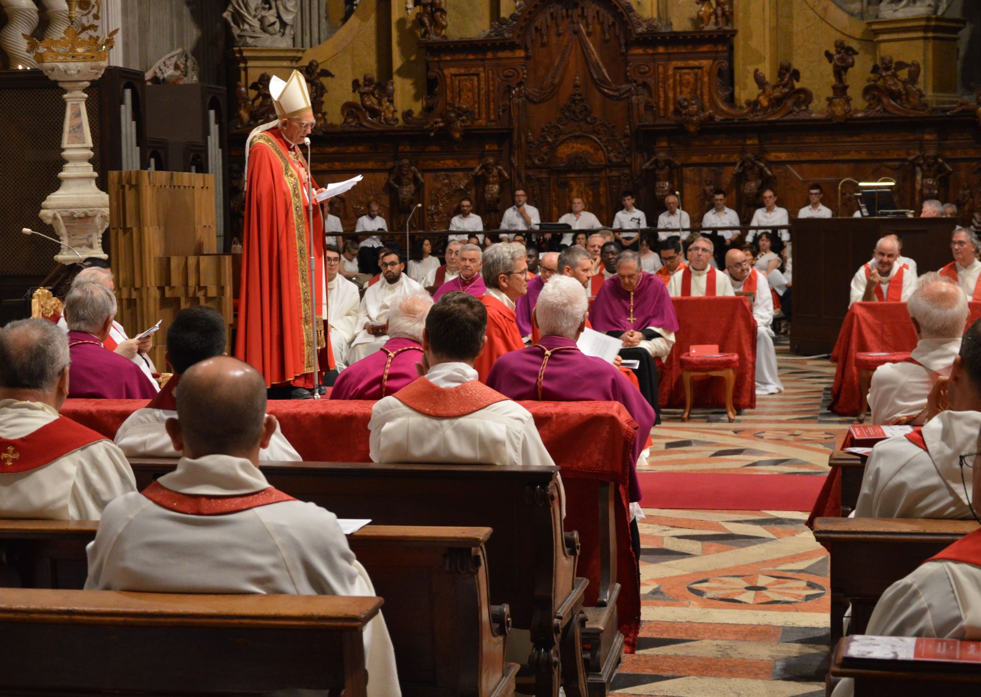 - Gli altri sacerdoti e diaconi, muniti di camice e stola rossa, si recheranno direttamente al proprio posto in Cattedrale.