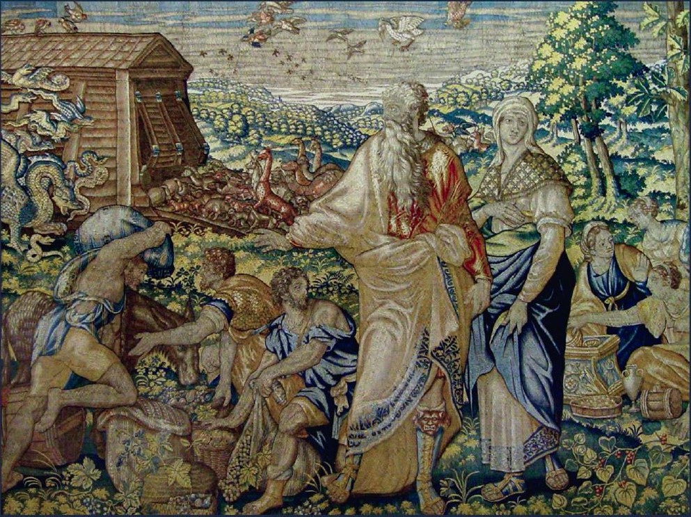 Gli arazzi, che da allora costituiscono il patrimonio dei tessili del Duomo, sono tutti della fine del Cinquecento, e si presentano differenti per tipologie e per dimensioni. Sei arazzi sono lunghi – ciascuno di 4,60 metri per 1,5 di altezza – raffigurano scene di caccia e scene cavalleresche; un settimo arazzo è alto – metri 3,25 per 2,44 di altezza – è detto “del Nuovo Mondo”, perché raffigura piante e frutti delle Americhe con al centro un tacchino, uccello allora esotico per gli europei; l’ottavo arazzo, ed è questo oggi esposto, si distingue per l’imponenza delle dimensioni – metri 5,35 di lunghezza per metri 4,50 di altezza – e per il soggetto biblico raffigurato: il patriarca Noè mentre fa entrare gli animali nell’arca.