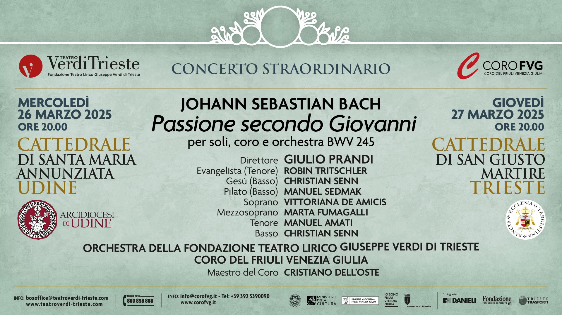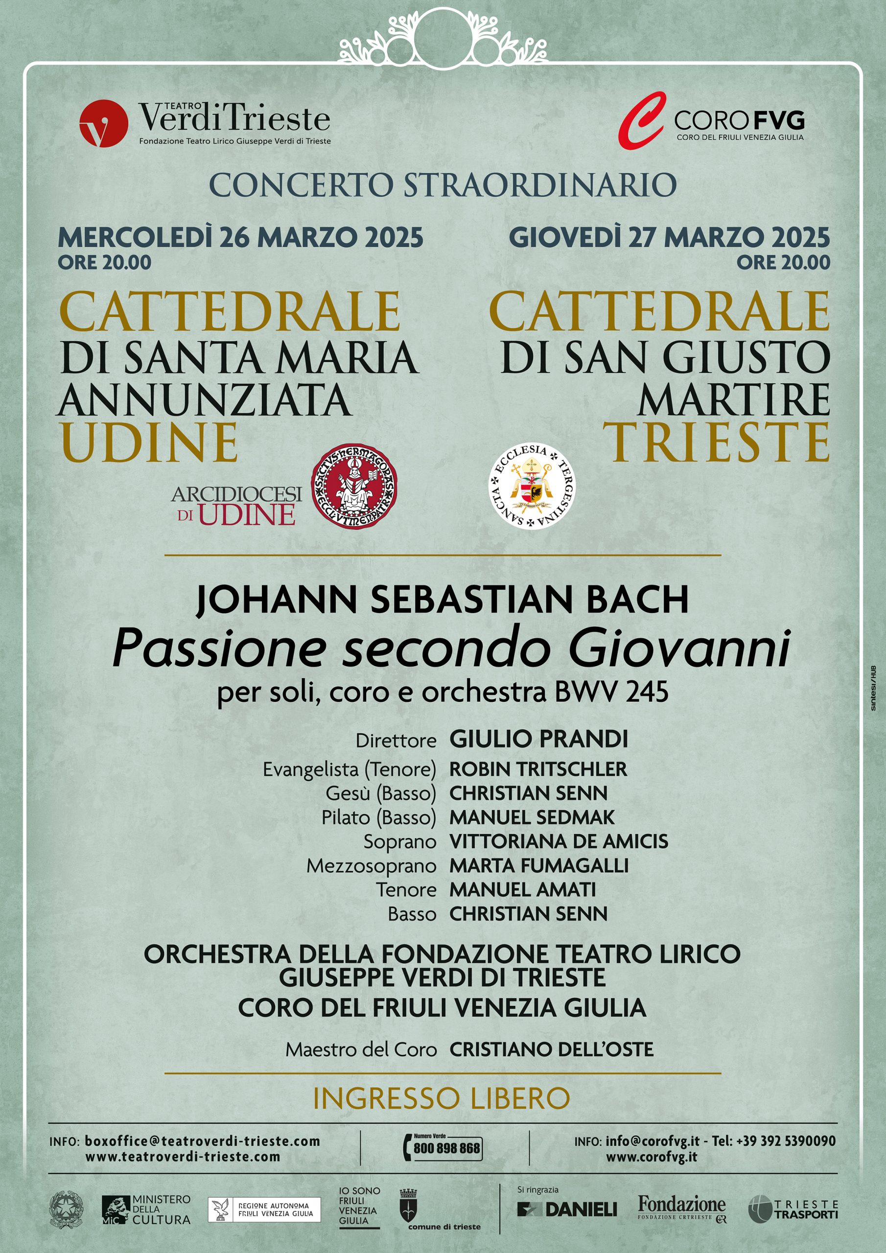 A supporto del cammino della Quaresima le cattedrali di Udine e Trieste si uniscono simbolicamente in musica grazie alla Passione secondo Giovanni di Johann Sebastian Bach BWV 245 e alla collaborazione dell’Orchestra della Fondazione Teatro Lirico Giuseppe Verdi di Trieste con il Coro del Friuli-Venezia Giulia, sotto l’egida della Regione FVG. Lo straordinario concerto sarà eseguito in entrambe le città: nella Cattedrale di Santa Maria Annunziata di Udine mercoledì 26 marzo, alle 20, mentre nella Cattedrale triestina di San Giusto l’appuntamento sarà giovedì 27 marzo, sempre alle 20.