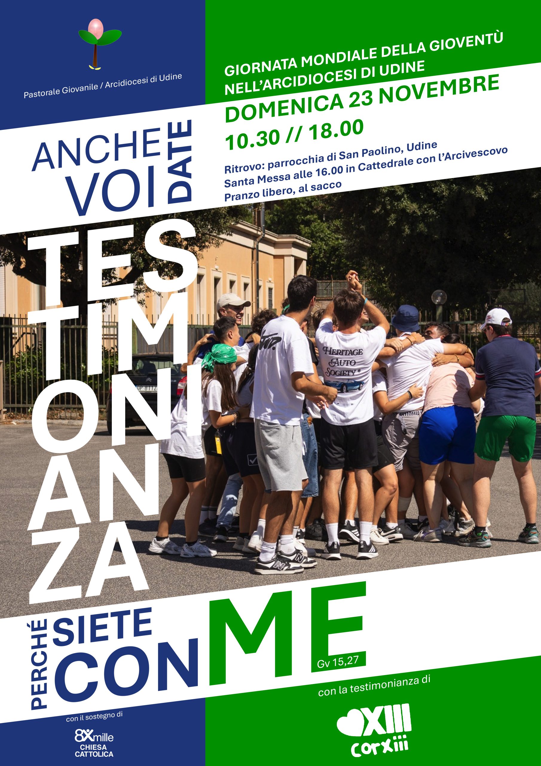«Anche voi date testimonianza perché siete con me». Un versetto del Vangelo di Giovanni (15,27) dà il tema all’edizione 2025 della Giornata mondiale della Gioventù che sarà vissuta anche nell’Arcidiocesi di Udine e sarà curata dall’Ufficio diocesano di Pastorale giovanile. Per adolescenti e giovani l’appuntamento sarà per domenica 23 novembre a partire dalle 10.30 con ritrovo nella sala parrocchiale di San Paolino d’Aquileia, in viale Trieste a Udine.
