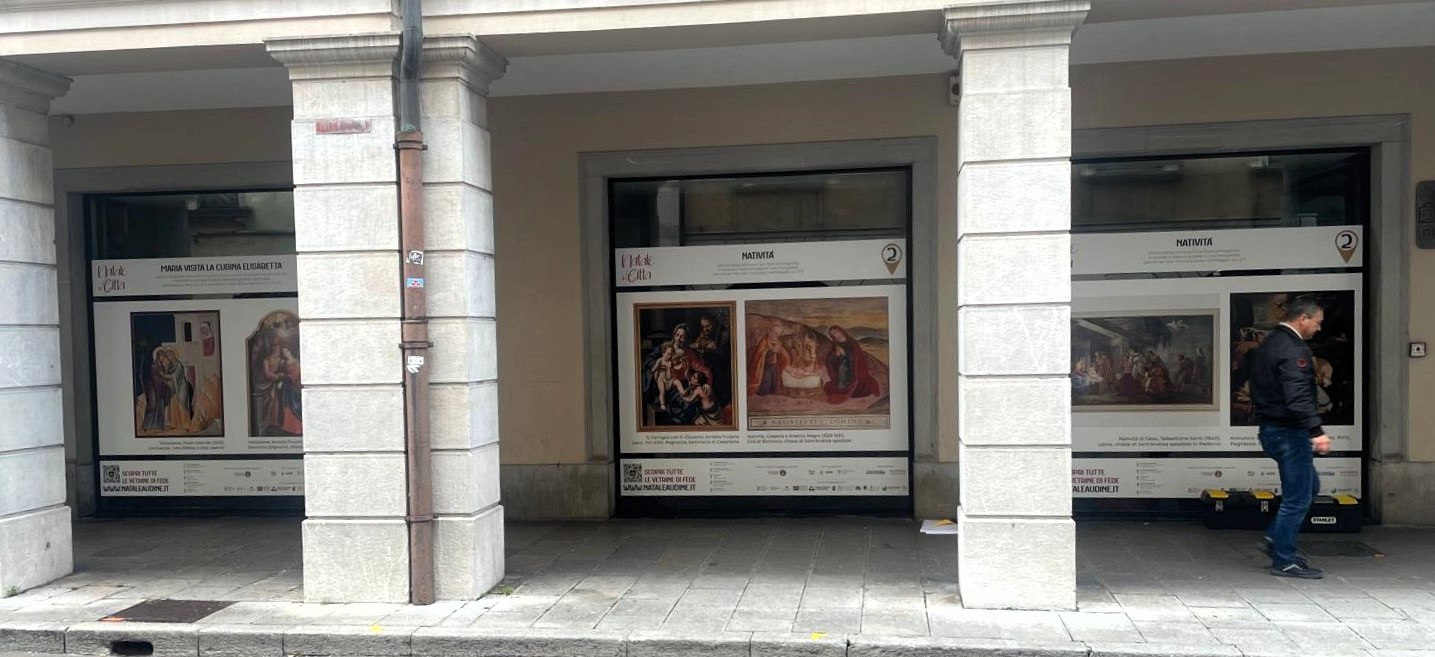 In collaborazione con Confcommercio Udine, fino all’11 gennaio undici vetrine di cinque negozi sfitti del centro cittadino sono state allestite con le riproduzioni di diciassette opere d’arte del territorio friulano, in un ideale percorso natalizio che parte dall’annuncio dell’Angelo a Maria, passa per la visita alla cugina Elisabetta, il sogno di Giuseppe, la natività, la fuga in Egitto, l’adorazione dei Magi e si conclude con il Battesimo di Gesù. Opere di Cercivento e di Sauris, di Gris di Bicinicco e di Dignano, Prepotto e Sutrio, Udine e Castellerio, di varie epoche storiche, riempiono spazi altrimenti vuoti sotto i portici di via Vittorio Veneto, via Cavour, piazza San Giacomo e via Sarpi; un emblema artistico del vuoto riempito da Gesù con la sua venuta nel mondo.