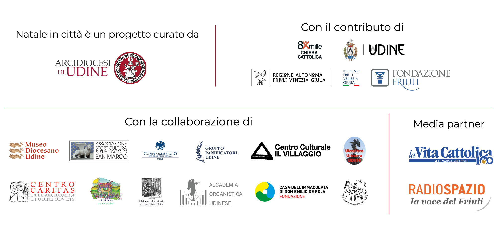 Il cartellone di eventi è realizzato con il contributo del Comune di Udine, della Regione Friuli-Venezia Giulia, della Fondazione Friuli e dell’8xmille alla Chiesa Cattolica. Numerosi i partner del progetto: il Museo diocesano e Gallerie del Tiepolo, Confcommercio Udine, l’associazione culturale “San Marco”, il centro culturale “Il Villaggio”, le Parrocchie del Vicariato urbano, la Caritas diocesana, la Biblioteca “Bertolla”, l’Accademia organistica udinese, l’associazione presepistica italiana e la Fondazione Casa dell’Immacolata.