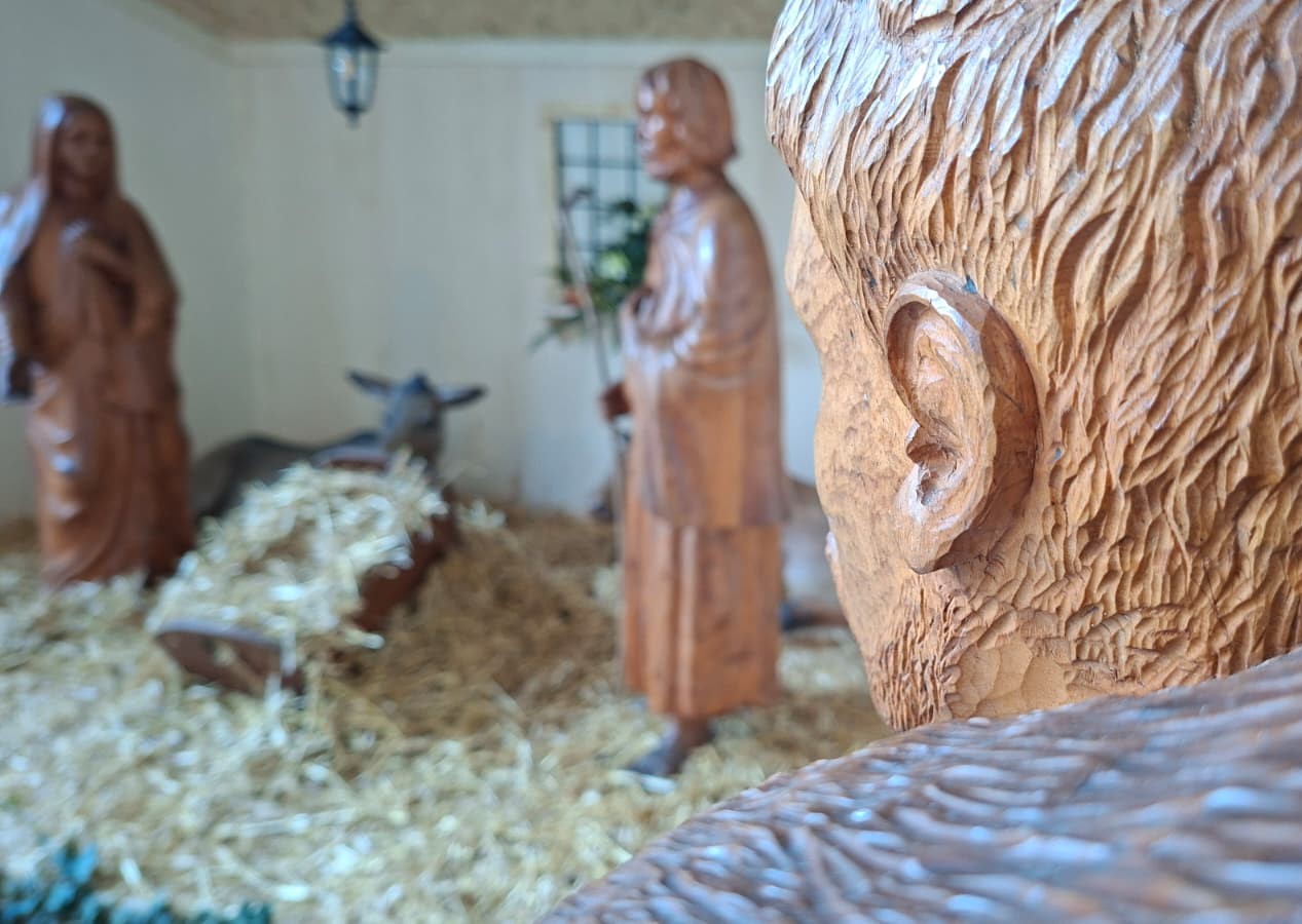 Il presepe, infine, si può ammirare a distanza… oppure si può compiere qualche passo tra le statue, immedesimandosi in un personaggio della scena della natività. A Gesù ci si avvicina per scelta e la sua umile bellezza affascina chi si avvicina a lui. Per rendere più efficace questo aspetto, l’Angelo che porta l’annuncio della nascita di Cristo guarda verso un punto apparentemente vuoto della scena: è il luogo dove si può sostare in contemplazione e preghiera, ascoltando l’annuncio dell’Angelo che, con lo sguardo, pare rivolgersi proprio al visitatore.