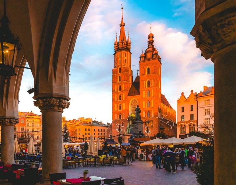 Nella foto: la piazza del mercato di Cracovia, con la basilica di Santa Maria.