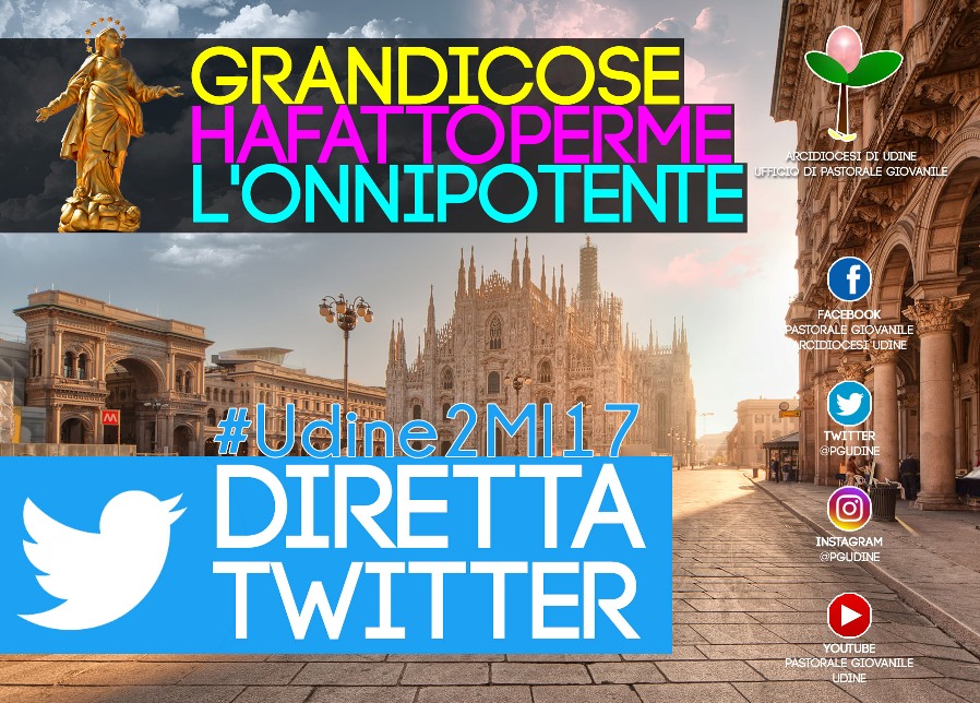 Sono un centinaio di giovani della nostra Diocesi che in questi gioprni sono Milano dove stanno vivendo l’ormai tradizionale “esperienza estiva”. L’iniziativa è promossa dall’Ufficio di Pastorale giovanile: si tratta di una settimana di riflessioni, di conoscenza, di divertimento e di preghiera nel segno del tema «Grandi cose ha fatto per me l’onnipotente» (Lc 1, 49). Anche questa volta sarà possibile, grazie ai social network, seguire in diretta e quindi condividere, anche se a distanza, l’esperienza dei ragazzi: qui confluiranno infatti post Twitter, pubblicati con l’hashtag ufficiale #Udine2MI17. Lo stesso hashtag è attivo anche su Facebook e su Instagram.