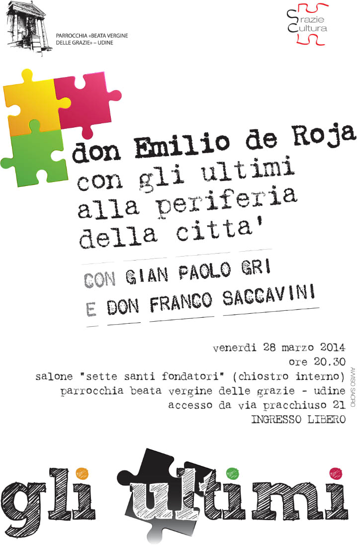 Venerdì 28 marzo 2014, alle ore 20.30 presso la Sala dei Sette Santi Fondatori (interna al chiostro della Basilica “Beata Vergine delle Grazie”, accesso da via Pracchiuso 21) avrà luogo l’incontro “Den Emilio de Roja con gli ultimi, alla periferia della città”. L’appuntamento rientra nell’ambito de “Gli Ultimi”, ciclo di incontri organizzati dall’associazione GrazieCultura.