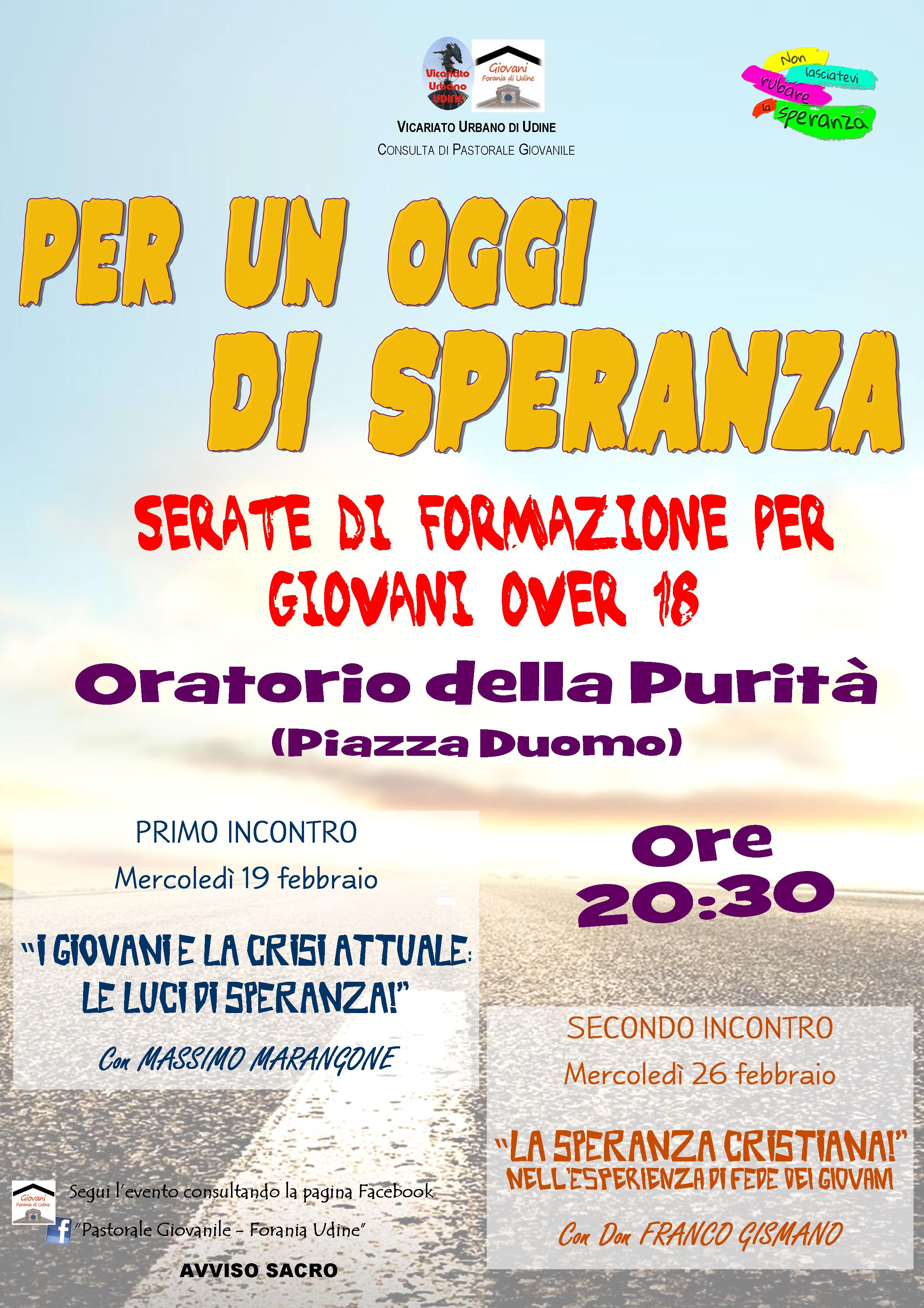 Il secondo e ultimo appuntamento del mini-ciclo “Per un oggi di speranza” avrà luogo mercoledì 26 febbraio, alle ore 20.30 presso i locali dell’Oratorio della Purità, in piazza del Duomo (Udine). Questo secondo appuntamento sarà animato da don Franco Gismano, sacerdote isontino docente di Teologia Morale presso il Seminario e l’Istituto Superiore di Scienze Religiose di Udine.