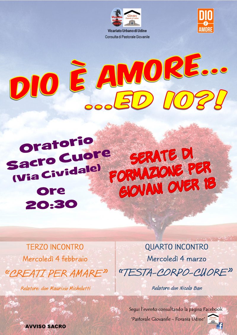 Nel nuovo oratorio della parrocchia del Sacro Cuore di Gesù, in via Cividale a Udine, proseguono gli incontri sul tema «Dio è amore… ed io?», organizzati dalla Consulta cittadina di Pastorale giovanile. Mercoledì 4 febbraio, dalle ore 20.30, il responsabile della Pastorale giovanile diocesana, don Maurizio Michelutti, condurrà la riflessione sul tema dell’affettività e sessualità nella dimensione spirituale: «Come ci vuole Dio nella relazione affettiva … Continua a leggere venerdì30Gennaio 07:54 I giovani della città di Udine riflettono su affetti e sessualità 30/01/2015 07:54 »